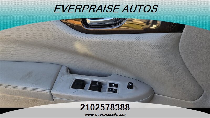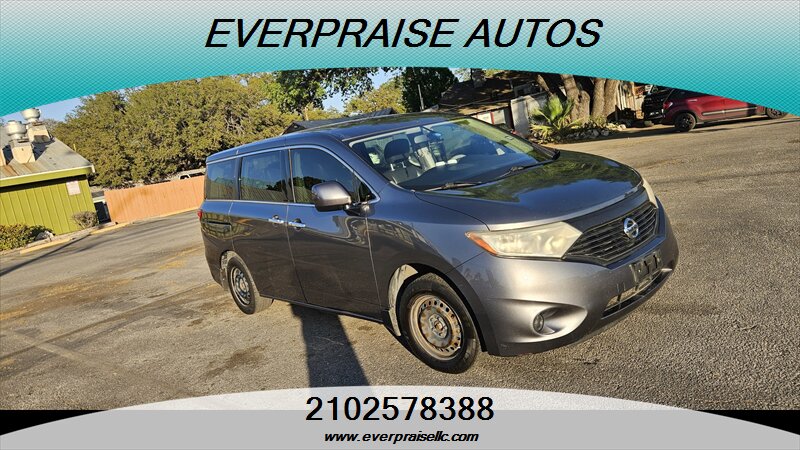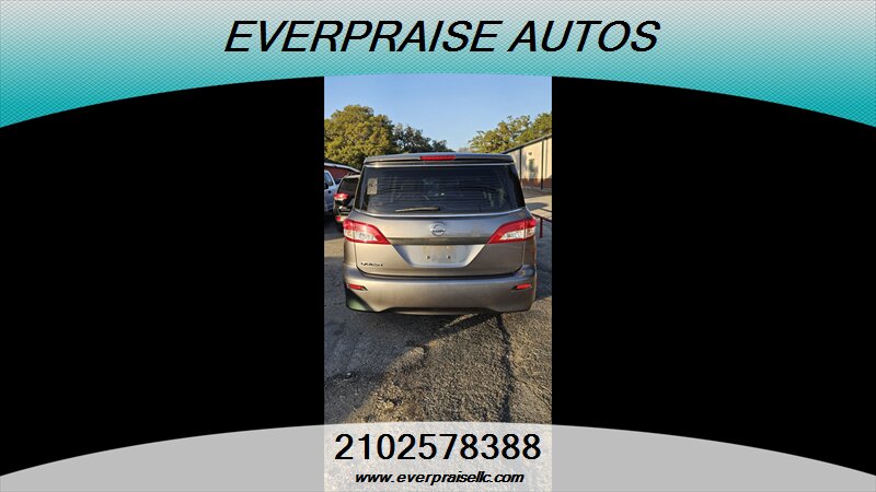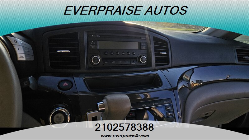 2015 Nissan Quest 3.5 S — Powered by a 3.5L V6 producing 260 hp and 240 lb-ft of torque, paired with a smooth automatic transmission. Factory-standard features include seating for seven, second-row captain’s chairs, a folding third row, tri-zone automatic climate control, power windows/locks/mirrors, cruise control, keyless entry and push-button start, power sliding doors and rear liftgate, AM/FM/CD audio with Bluetooth and USB/AUX inputs, steering-wheel audio controls, rearview camera, alloy wheels, and full safety suite with ABS, traction/stability control and multiple airbags. Exterior: Black. Interior: Black. Fuel economy: 20 MPG city / 27 MPG highway. Vehicle is in excellent overall condition — ready for family trips or daily driving. 2015 Nissan Quest 3.5 S — Con motor 3.5L V6 de 260 hp y 240 lb-ft de torque, combinado con una transmisión automática suave. Las características de fábrica incluyen capacidad para siete pasajeros, sillas capitán en la segunda fila, tercera fila plegable, control climático automático tri-zona, ventanas/bloqueos/espejos eléctricos, control de crucero, entrada sin llave y botón de encendido, puertas corredizas y portón trasero eléctricos, equipo de audio AM/FM/CD con Bluetooth y entradas USB/AUX, controles de audio en el volante, cámara trasera, rines de aleación y un paquete completo de seguridad con ABS, control de tracción/estabilidad y múltiples airbags. Exterior: Negro. Interior: Negro. Consumo: 20 MPG ciudad / 27 MPG carretera. El vehículo está en excelente condición general — listo para viajes familiares o el uso diario. Everpraise LLC 7916 Fredericksburg Rd San Antonio, TX 78229 (210) 257-8388