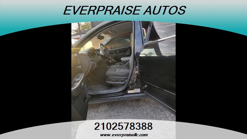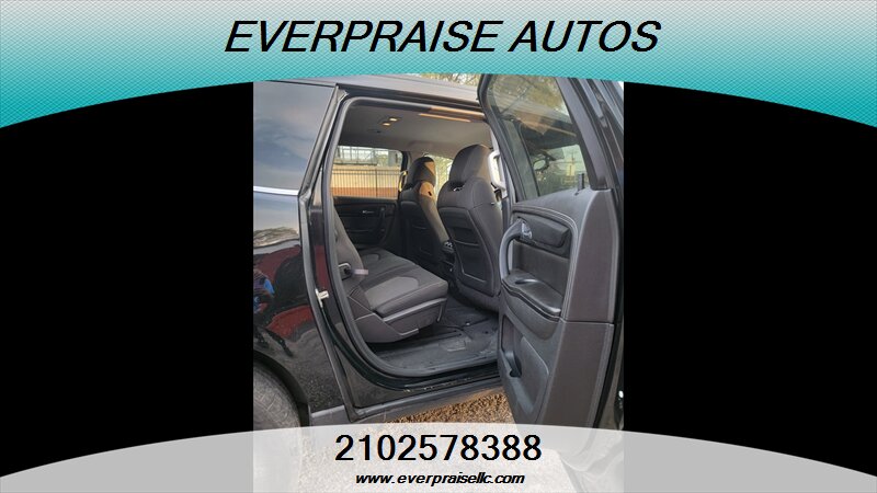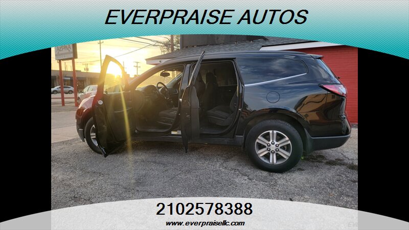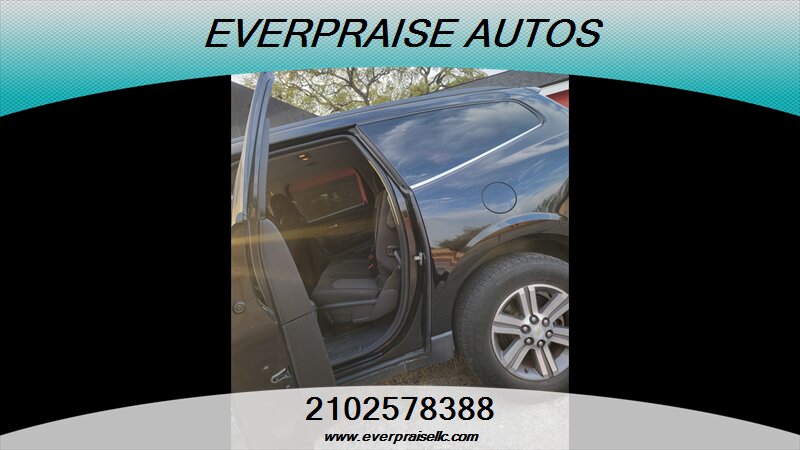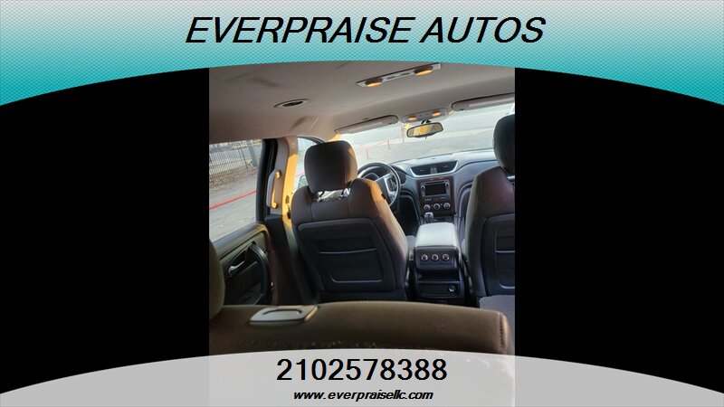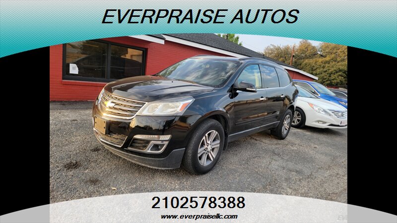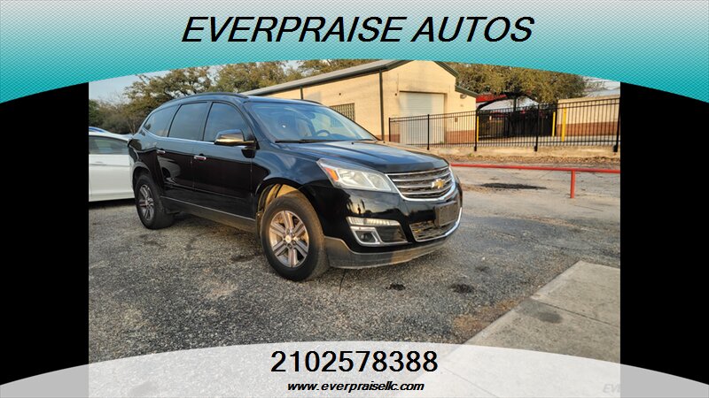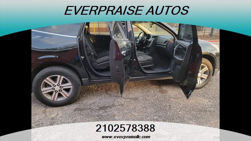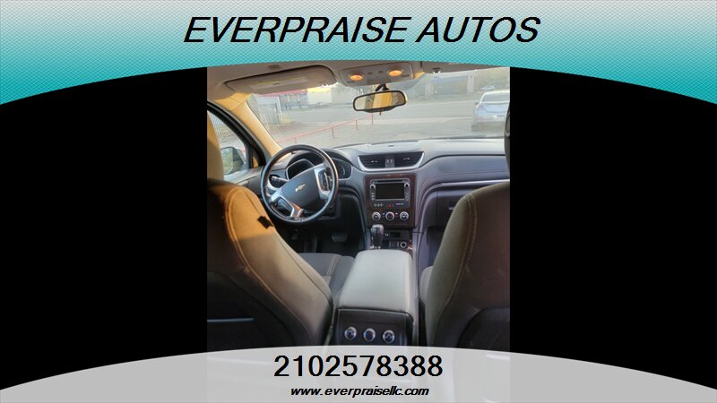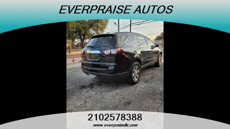 2017 Chevrolet Traverse LT in Mosaic Black Metallic with Dark Titanium/Light Titanium interior. Powered by a 3.6L V6 that makes 281 hp and 266 ft-lbs of torque, this three-row SUV returns about 15 MPG city and 22 MPG highway and is in excellent overall condition. Factory features include seating for 7–8 passengers, tri-zone automatic climate control, Chevrolet MyLink touchscreen infotainment with Bluetooth and USB inputs, rear vision camera, steering-wheel audio and cruise controls, power windows/locks/mirrors, remote keyless entry, alloy wheels and roof rails. Standard safety gear includes ABS, traction and stability control, tire pressure monitoring and multiple airbags, with OnStar and additional connectivity options available. 2017 Chevrolet Traverse LT en Mosaic Black Metallic con interior Dark Titanium/Light Titanium. Equipada con un motor 3.6L V6 que entrega 281 hp y 266 lb-ft de torque, esta SUV de tres filas ofrece aproximadamente 15 MPG en ciudad y 22 MPG en carretera y está en excelente estado general. Las características de fábrica incluyen capacidad para 7–8 pasajeros, control de clima automático de tres zonas, sistema de infoentretenimiento Chevrolet MyLink con pantalla táctil, Bluetooth y entradas USB, cámara trasera, controles de audio y crucero en el volante, elevalunas/seguros/espejos eléctricos, entrada remota sin llave, rines de aleación y barras en el techo. La seguridad de serie incluye ABS, control de tracción y estabilidad, monitoreo de presión de neumáticos y múltiples airbags; OnStar y opciones de conectividad adicionales están disponibles. Everpraise LLC 7916 Fredericksburg Rd San Antonio, TX 78229 (210) 257-8388